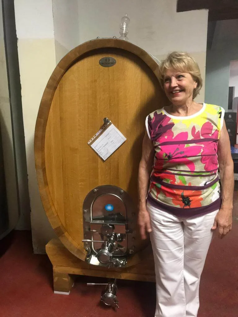 Hilde with an oak barrel in the Vigna Petrussa winery.