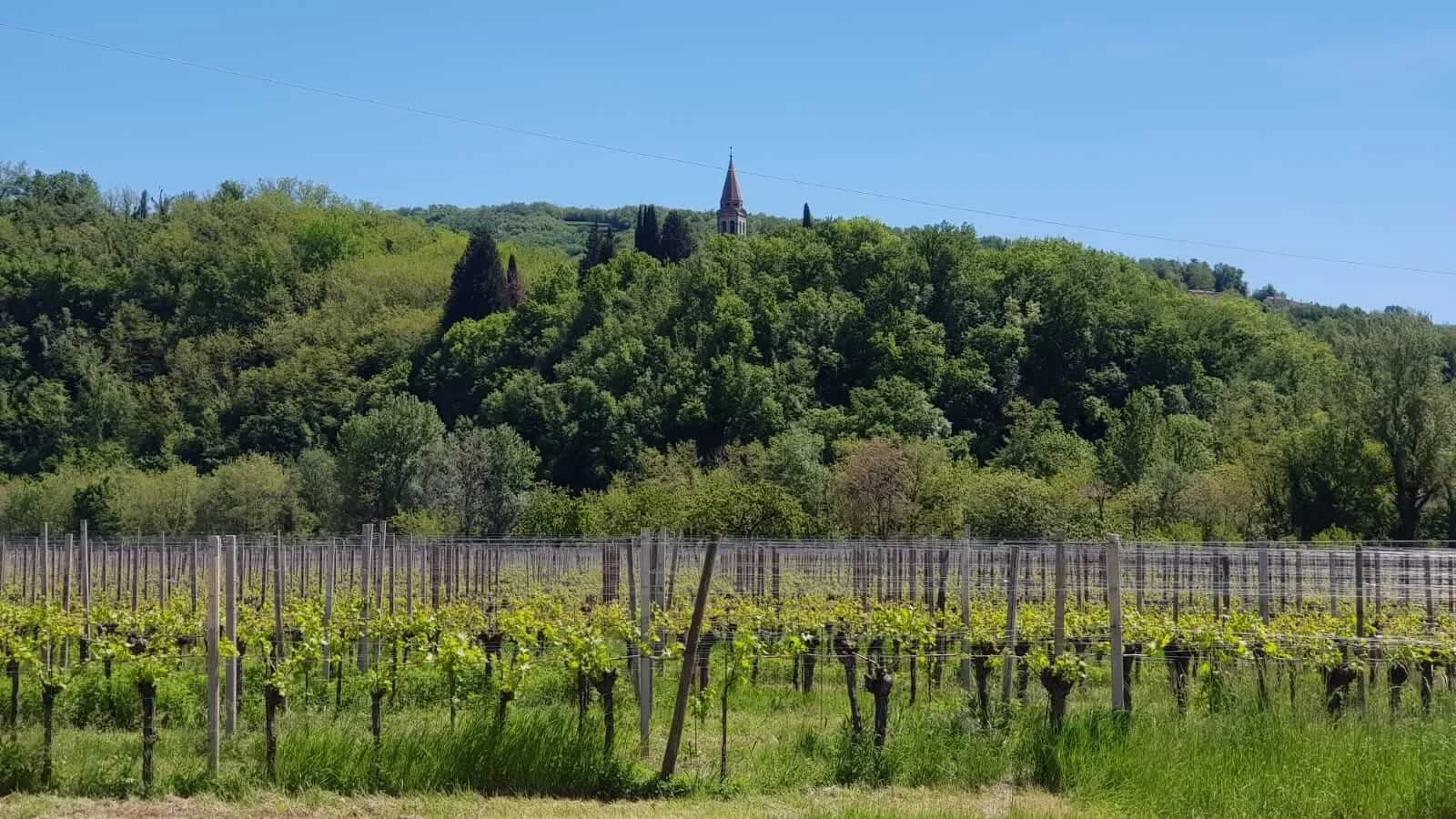 Vigna Petrussa vineyards, right next to their home, in Friuli. The boarder with Slovenia is right after the vines, where the trees are in the distance.
