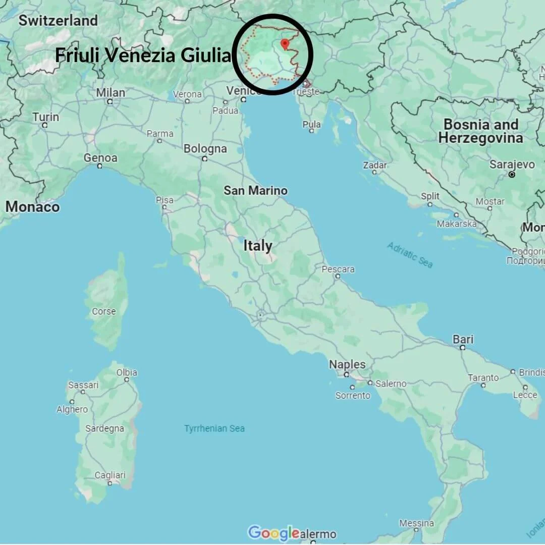 Location of Friuli Venezia Giulia in NorthEastern Italy, with Vigna Petrussa marked with a red dot on the Slovenian border.